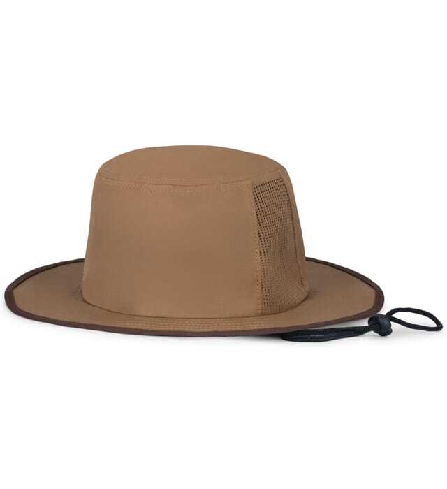 * 100% polyester * Perforated side panels * Wicks moisture * 3-inch wide brim * Drawcord adjustable