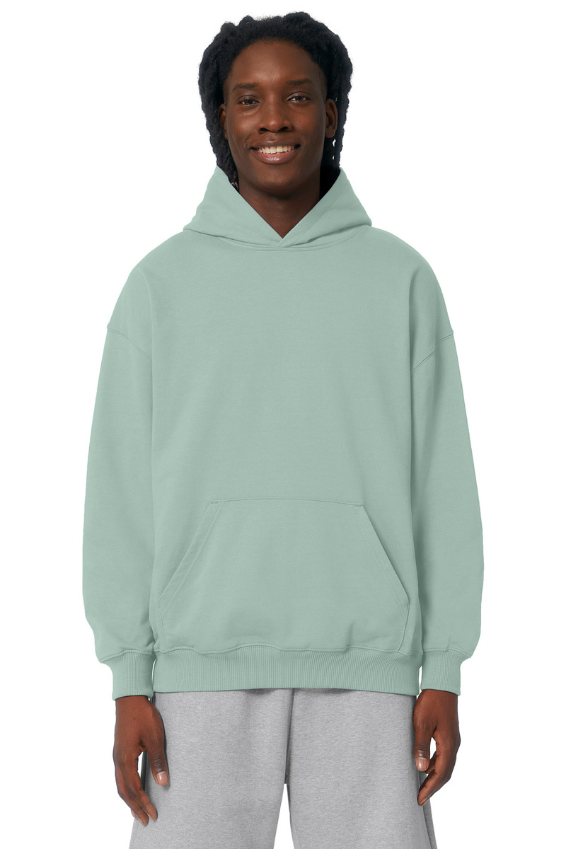 A boxy hoodie with a dry hand feel. The unique character of organic cotton French terry provides a perfect place for a brand logo. 11.8-ounce (400 GSM) 100% organic combed cotton French terry Double-layer self-fabric hood Jersey back neck taping Self-fabric half moon at back neck 2x1 rib knit cuffs and hem Double-needle topstitch on armholes, cuffs and hem Front pouch pocket 100% recycled polyester tear-away label Oversized fit: Designed for comfort, with more ease of movement.