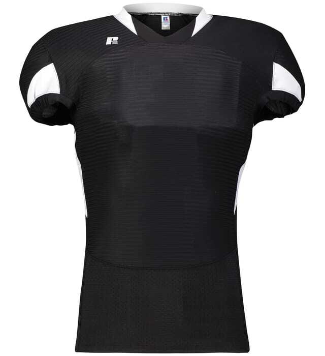 * Reinforced Xtreme Compression cloth 86% nylon/14% spandex body and 2-ply yoke * 86% polyester/14% spandex (white) * SM cloth mesh lower front, back and side panels * V-neck collar * Set-in cap sleeves with contrast color half-elastic cuffs for secure fit over pads * Shoulder pad pockets to prevent pads from slipping out * Waist length with 1/2" elastic hem